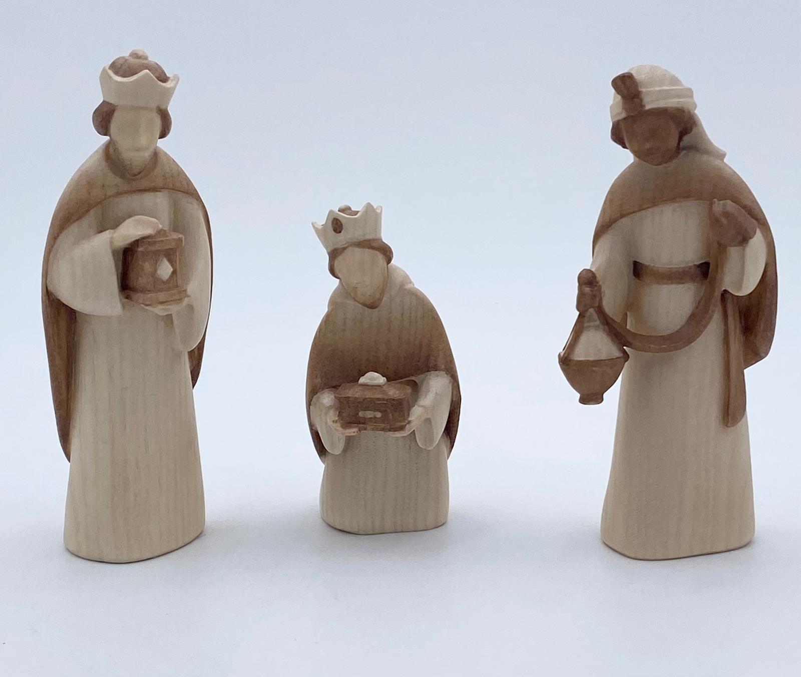 Caspar, Melchior und Balthasar, die mit Gold, Weihrauch und Myrrhe zur Geburt Christi kommen, sind aus hochwertigem Eschenholz im modernen Südtirol Stil geschnitzt.